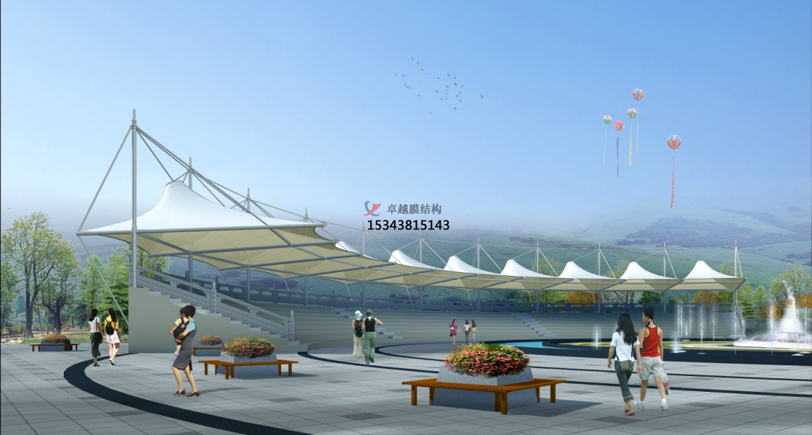 索膜結(jié)構(gòu)看臺(tái)景觀應(yīng)用場(chǎng)景:其應(yīng)用場(chǎng)景廣泛,可在教育領(lǐng)域、公共空間、商業(yè)與文旅等場(chǎng)景使用。在教育領(lǐng)域內(nèi),學(xué)校操場(chǎng)看臺(tái)提供遮陽避雨功能,適用于運(yùn)動(dòng)會(huì)、升旗儀式等集體活動(dòng),其開放結(jié)構(gòu)增強(qiáng)空間互動(dòng)性,為師生提供舒適的觀看空間,也為校園增添了現(xiàn)代化的景觀元素;在公共空間,城市公園、廣場(chǎng),作為休憩亭或藝術(shù)裝置,提升景觀趣味性與實(shí)用性,由于其大跨度覆蓋看臺(tái)及賽場(chǎng),無立柱設(shè)計(jì)保障視野開闊,輕量化結(jié)構(gòu)提升抗震性等特性,尤其適合在體育場(chǎng)館應(yīng)用;在商業(yè)與文旅中,商業(yè)街區(qū)臨時(shí)展區(qū)、景區(qū)廊亭等,通過膜結(jié)構(gòu)打造標(biāo)志性視覺焦點(diǎn),吸引人流并承載多功能需求,同時(shí)與自然景觀相融合,成為景區(qū)的一道亮麗風(fēng)景線。