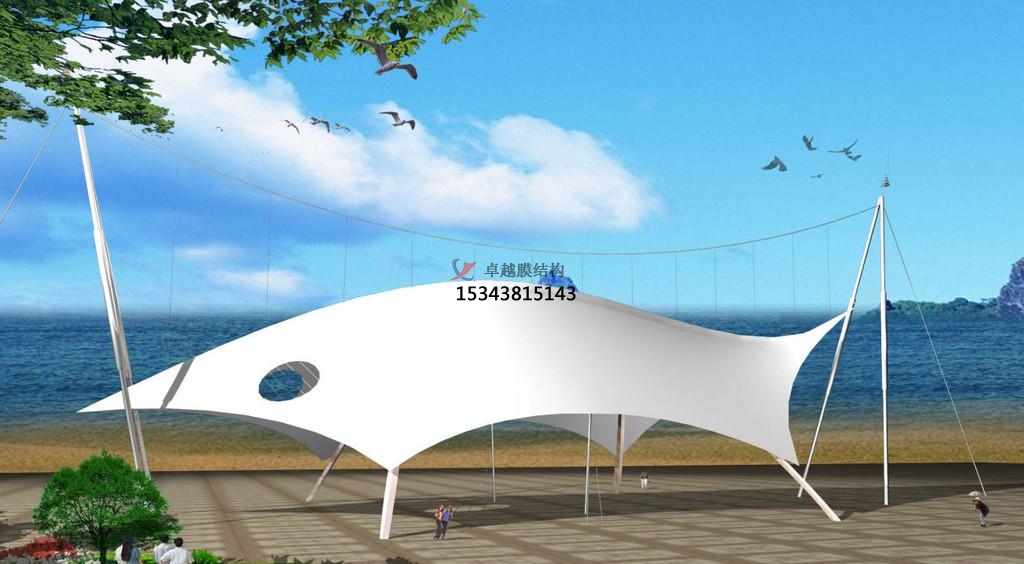 以膜材、鋼索及支柱構(gòu)成,利用鋼索與支柱在膜材中導(dǎo)入張力以達安 定的形式。除了可實踐具創(chuàng)意,創(chuàng)新且美觀的造型外,也是比較能展現(xiàn)膜結(jié) 構(gòu)精神的構(gòu)造形式。 大型跨距空間也多采用以鋼索與壓縮材構(gòu)成鋼索網(wǎng)來支撐上部膜材的形式。因施工精度要求]高,結(jié)構(gòu)性能強,且具豐 富的表現(xiàn)力,所以造價略高于骨架式景觀膜結(jié)構(gòu)遮陽棚。