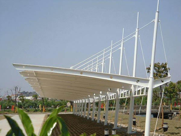 膜結(jié)構(gòu)停車(chē)棚后面是硬邊,前面挑起,使用拉索拉起固定,前后有落差,方便排水.另外有一種雙挑的也可歸類(lèi)到平頂式里面.