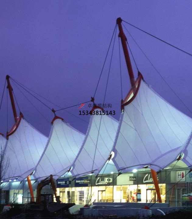 2、 透光性:透光性是現(xiàn)代膜結(jié)構(gòu)更被廣泛認(rèn)可的特性之一。膜材的透光性可以為建筑提供所需的照度,這對于建筑節(jié)能十分重要。對于一些要求光照多且亮度高的商業(yè)建筑等尤為重要。通過自然采光與人工采光的綜合利用,膜材透光性可為建筑設(shè)計提供更大的美學(xué)創(chuàng)作空間。夜晚,透光性將膜結(jié)構(gòu)變成了光的雕塑。