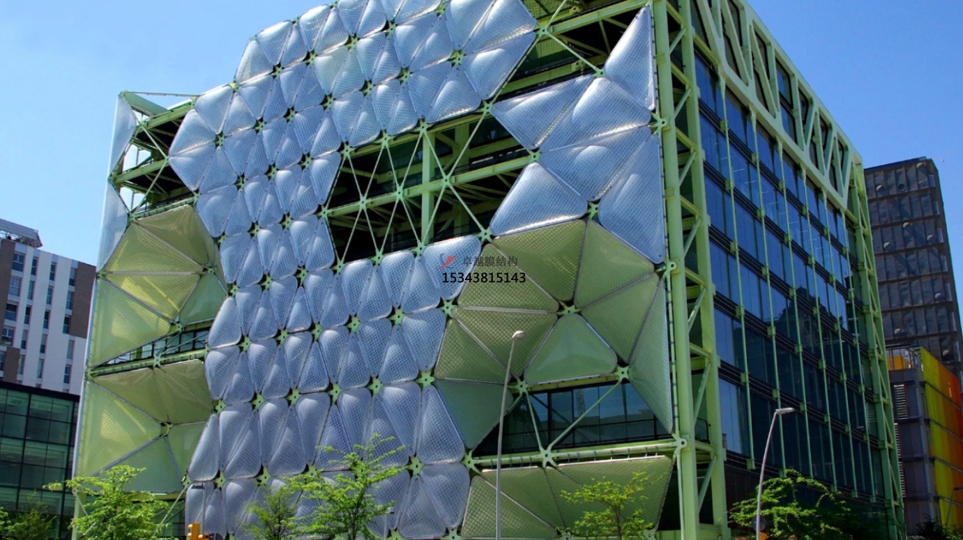 ETFE膜溫度基本與周圍環(huán)境溫度保持一致,不像玻璃會(huì)隨吸收輻射能力的增加而升溫,因此材料自身吸收或輻射能量的能力并不十分關(guān)鍵。除了在材料上進(jìn)行的能量交換,由于氣體泄漏造成的能量損失可忽略不計(jì),氣枕式膜結(jié)構(gòu)連接構(gòu)件可有效避免空氣的外泄,同時(shí)構(gòu)件數(shù)量原本就較少,由此產(chǎn)生的節(jié)能效益相當(dāng)于玻璃的3~4倍。