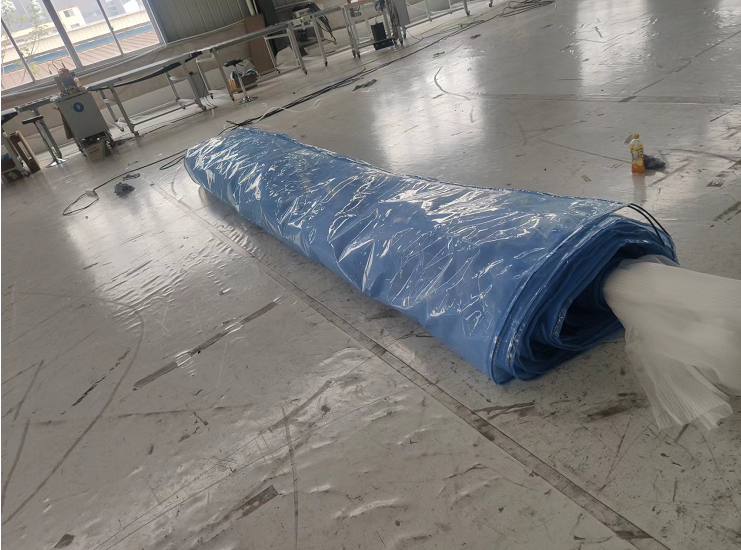 焊接完成,人工收卷,200平方一個氣枕,用了8個才卷起來。