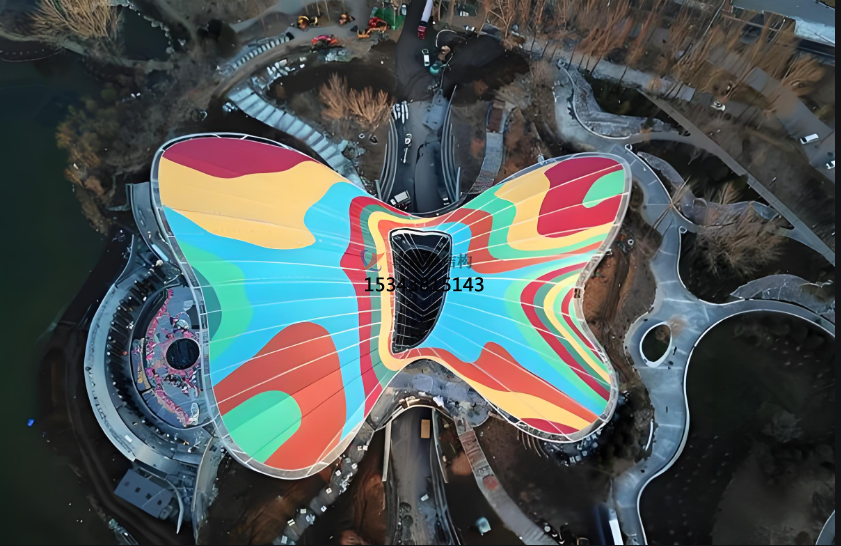 ETFE膜材除了常規(guī)的透明、藍色、白色、銀色鍍點外,其實還有五顏六色的彩色系列。今天就給大家介紹一個ETFE彩色膜應(yīng)用的經(jīng)典案例2019年北京世園會的主場館——媯汭劇場,外觀為彩色蝴蝶造型。