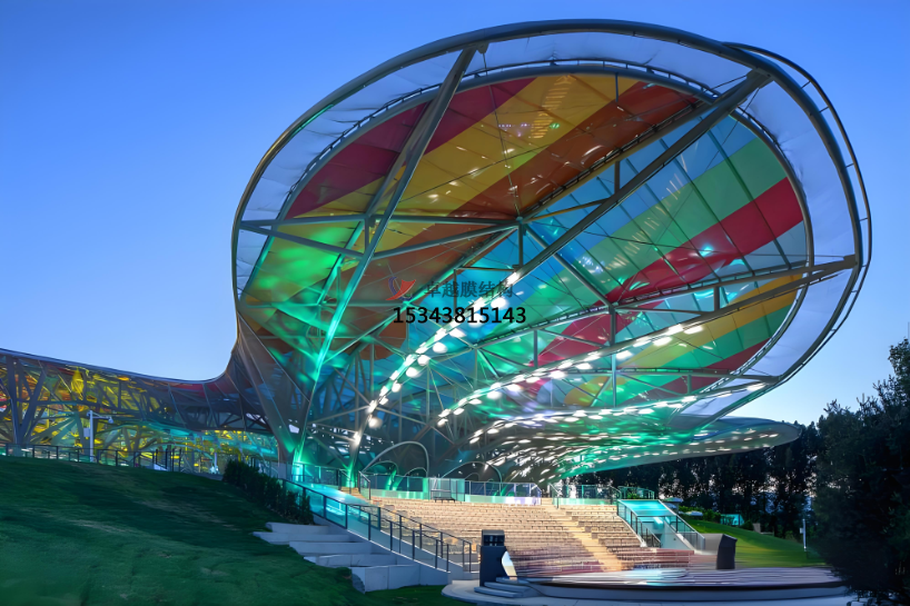 ETFE膜是一種厚度小于0.4毫米,呈透明形態(tài)的超薄膜材,它的透光率可以根據(jù)建筑需求進行調(diào)節(jié)制定。劇場使用的膜透光率在20%至40%之間,用于屋面結(jié)構(gòu)可以起到“透光不透視”的效果,既可最大限度利用自然光線,實現(xiàn)柔和采光,又可避免五彩斑斕的色彩對人的視覺干擾。