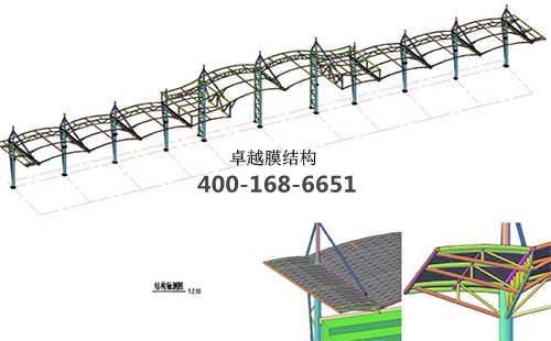 本工程膜材采用白色高端國產(chǎn)膜材PVDF高自潔環(huán)保建筑膜材,鋼結構采用更好的標準Q235B鋼材,表面采用酚醛底漆處理,面漆采用白色鋼結構專用快干磁漆。