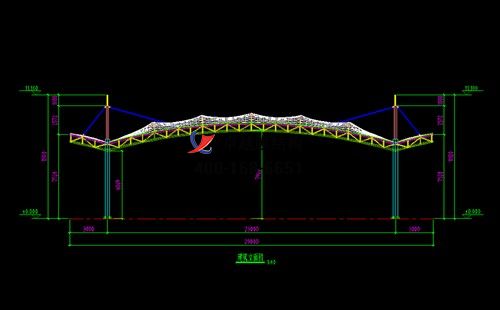 本工程膜材采用白色高端國產(chǎn)星益達(dá)PVDF高自潔環(huán)保建筑膜材,鋼結(jié)構(gòu)采用更好的標(biāo)準(zhǔn)Q235B鋼材,表面采用酚醛底漆處理,面漆采用白色鋼結(jié)構(gòu)專用快干磁漆。