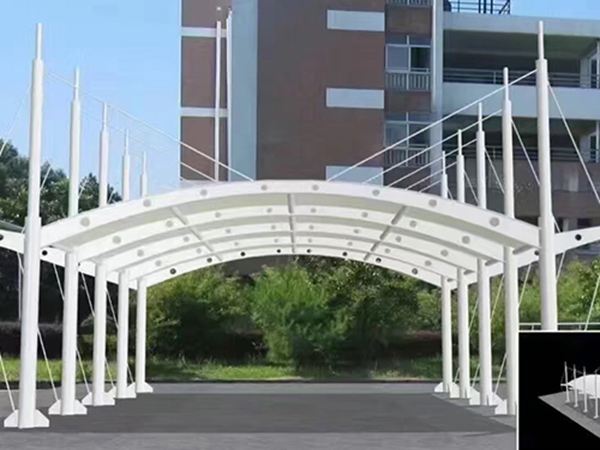 膜結(jié)構(gòu)車棚的安裝包括膜體展開、連接固定和張拉成形三個(gè)部分。除了一般雨蓬不可比擬的耐用、實(shí)用、遮風(fēng)擋雨的功能外,膜結(jié)構(gòu)雨蓬更是一座雕塑,一件藝術(shù)品,給人一種美的視覺享受。