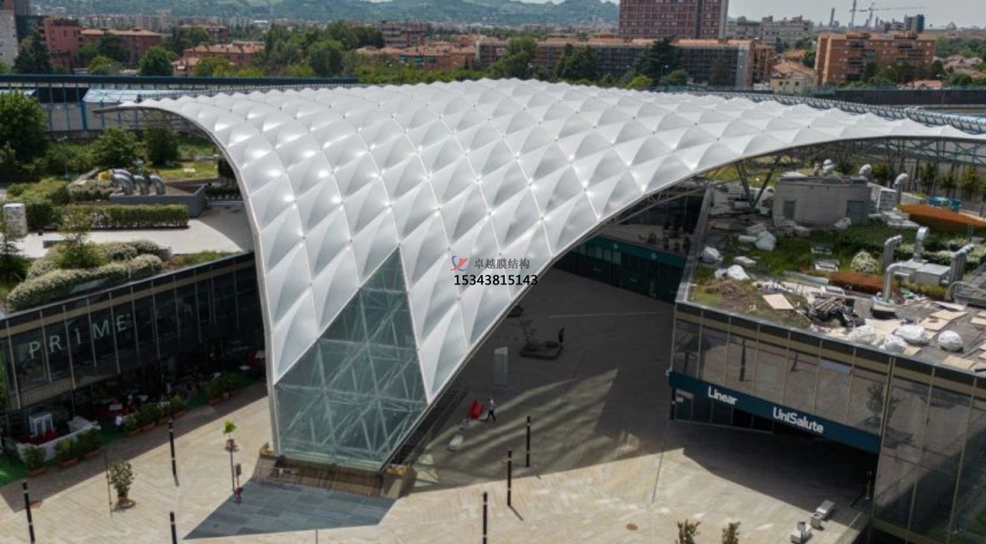 商業(yè)購物中心的主要特點是因商業(yè)店鋪的集中而形成了室內(nèi)室外購物、休閑、餐飲等功能空間,步行街及中央活動區(qū)域是人們行走、休息、交流的開放空間,基于商業(yè)街特色,就決定了所有設計的核心就是讓空間更具人性化。屋頂作為建筑附加設施,不僅要求遮陽避雨的實用功能,也應該是錦上添花的設施。目前國內(nèi)外膜結構應用于商業(yè)綜合體的工程案例越來越多,膜結構建造的屋頂擁有很多傳統(tǒng)屋頂所不具備的優(yōu)勢特點。