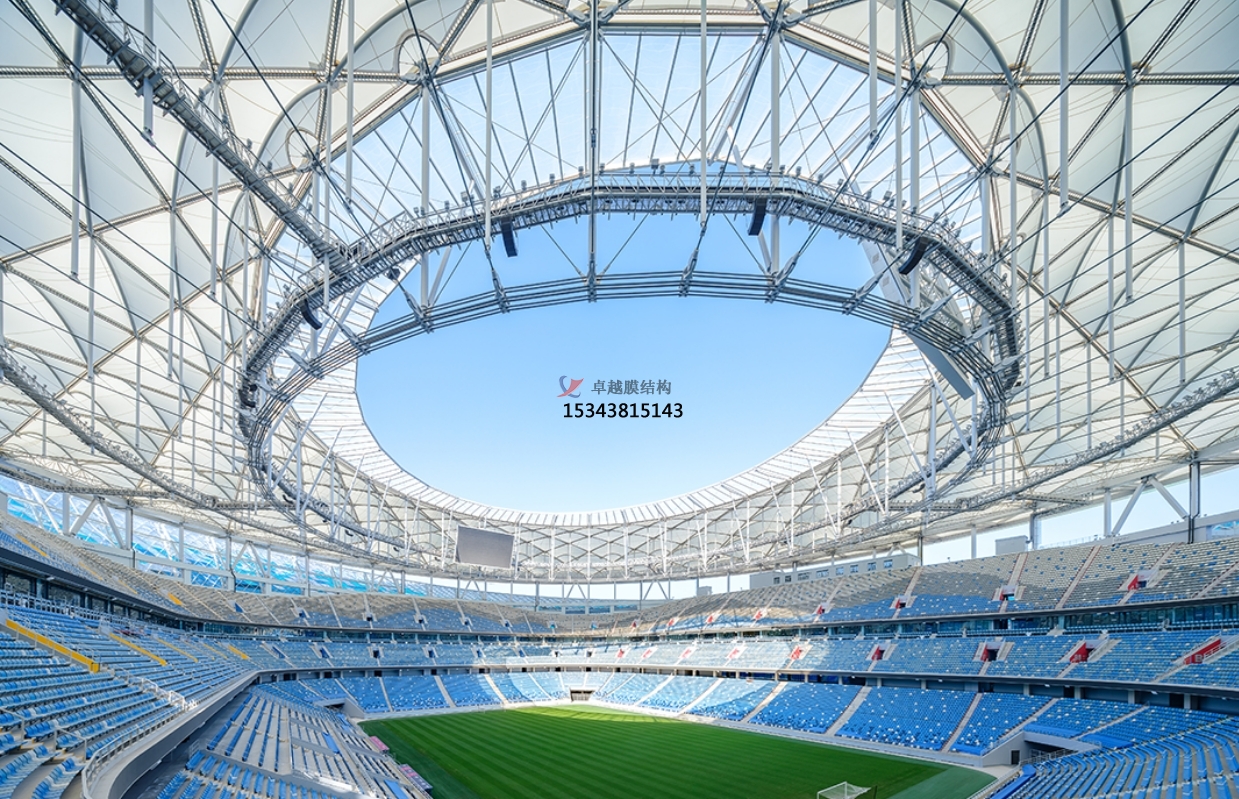 ETFE 膜的柔性特質(zhì)要求支撐結(jié)構(gòu)兼具強(qiáng)度與適應(yīng)性。典型案例如廈門新體育中心,采用 “巨拱 + 車輻式索網(wǎng)” 體系,通過 40 榀索桁架與內(nèi)環(huán)索形成三維受力網(wǎng)絡(luò),并在徑向索上方疊加獨(dú)立索網(wǎng),最終以 722 道托膜索與鋁合金槽實(shí)現(xiàn)膜面精準(zhǔn)張拉。這種設(shè)計(jì)不僅滿足了 86 米高空作業(yè)的穩(wěn)定性需求,更通過曲面造型優(yōu)化了排水效率。