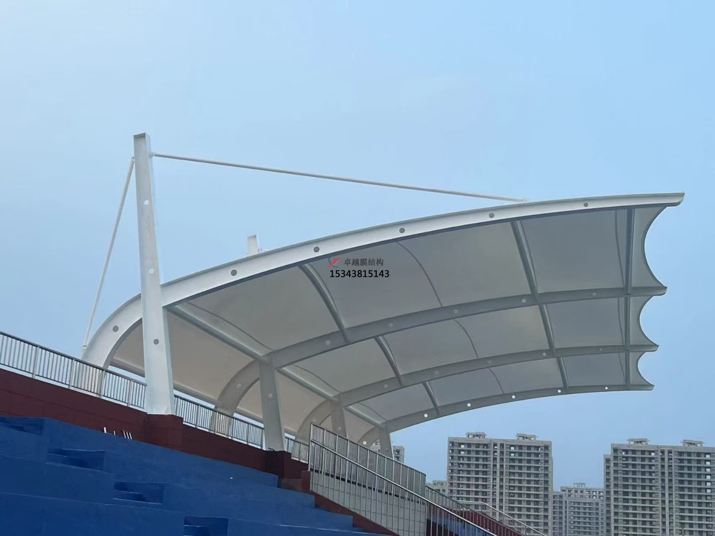膜結構在體育設施上主要應用在學校操場運動看臺或主席臺屋頂,另外大型體育場館看臺膜結構屋頂也屢見不鮮。一般看臺造型都是由貝殼形峰膜及端部張拉膜組成,形式新穎活潑。鋼架、索、膜巧妙結合,通過薄膜、膜邊索、脊索、谷索、拉索、拉桿及一定的格構梁來穩(wěn)定。膜頂平滑過渡,結構美觀、輕巧、整體造型相互輝映,別具一格。