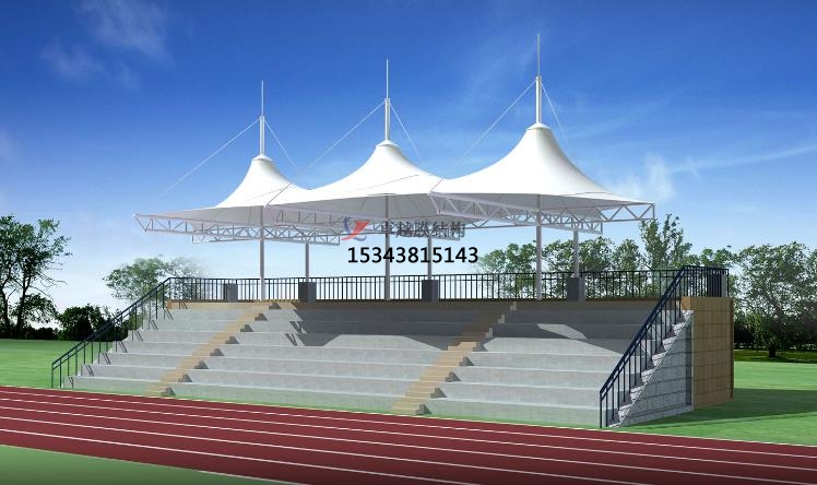 看臺張拉膜的功能:遮陽擋雨,環(huán)保節(jié)能,安全可靠,靈活定制??磁_張拉膜為觀眾提供了寬敞舒適的坐席,膜材透光性可提供所需照度,實現(xiàn)自然采光與人工采光結(jié)合,節(jié)省照明能耗,且夜間在燈光映射下形成絢麗景觀,同時具備遮陽擋雨的功能,確保在各種天氣條件下都能提供良好的觀賽體驗。采用可回收材料,生產(chǎn)消耗資源少,能反射陽光降低內(nèi)部溫度,減少空調(diào)使用,符合綠色建筑理念。由于其輕質(zhì)特性,看臺張拉膜對基礎(chǔ)的需求較低,減少了建筑材料的消耗,高質(zhì)量張拉膜強度高、抗腐蝕性能佳,能抵御紫外線、風霜雨雪等自然因素影響,長期使用無需頻繁大規(guī)模耗資維修保養(yǎng)??磁_張拉膜結(jié)構(gòu)設(shè)計要求合理安全,首先應用支承結(jié)構(gòu)的穩(wěn)定性,方便張拉膜面時把握控制點空間位置及實施張拉,膜材撕裂時不至于結(jié)構(gòu)整體倒塌,更換膜面施工方便。然后利用水平力的傳遞,采用合適構(gòu)造措施確保作用于膜面的荷載以膜面張力形式通過邊界索經(jīng)膜角節(jié)點板傳遞到支承結(jié)構(gòu)或基礎(chǔ)時,水平力可靠傳遞。其次利用結(jié)構(gòu)體系內(nèi)力的自平衡,將支承結(jié)構(gòu)體系設(shè)計成自平衡體系,減少膜面張力對下部結(jié)構(gòu)或地基的影響。最后根據(jù)結(jié)構(gòu)單元的重復與組合,利用基本外形的機構(gòu)單元組合形成大面積覆蓋空間時,注意膜面的熱合線在連接處要對齊,形成連續(xù)、流暢視覺效果。膜材料和支撐構(gòu)件經(jīng)嚴格檢測認證,設(shè)計施工考慮防火、防腐蝕等安全因素,結(jié)構(gòu)穩(wěn)定性好,發(fā)生意外坍塌危險性小??磁_張拉膜可以根據(jù)具體需求進行量身定制,適應各種形狀和尺寸,完美契合不同場合。