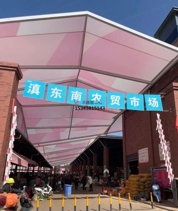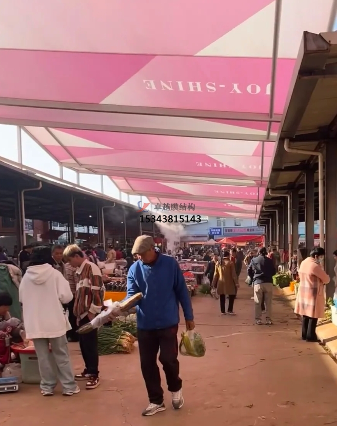 美觀與個(gè)性化彰顯:膜結(jié)構(gòu)設(shè)計(jì)極具創(chuàng)意,能依據(jù)農(nóng)貿(mào)市場所在區(qū)域的文化特色、建筑風(fēng)格,定制獨(dú)特造型與色彩?;蛉珈`動(dòng)的波浪,或似展翅的飛鳥,為傳統(tǒng)農(nóng)貿(mào)市場注入現(xiàn)代時(shí)尚元素,提升市場整體形象與辨識度。鮮明的色彩搭配,不僅能吸引消費(fèi)者目光,還能為市場營造活潑、熱鬧的氛圍,讓農(nóng)貿(mào)市場成為城市中一道獨(dú)特的人文景觀,成為居民休閑購物的好去處,帶動(dòng)周邊商業(yè)活力。