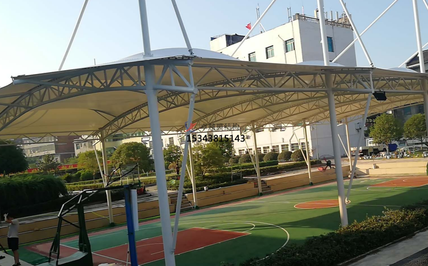 安裝支架:按照設(shè)計圖紙和尺寸要求,使用螺絲和螺母將雨棚支架固定在籃球場地面上。