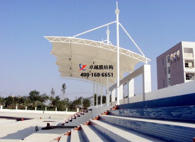膜結(jié)構(gòu)看臺(tái),周口體育場(chǎng)膜結(jié)構(gòu)看臺(tái)頂棚,膜結(jié)構(gòu)看臺(tái)雨棚,操場(chǎng)主席臺(tái)遮陽(yáng)棚等張拉形式膜結(jié)構(gòu)的先行者是德國(guó)的奧托(F.Otto),他在1955年設(shè)計(jì)的張拉膜結(jié)構(gòu)跨度在25m左右,用于聯(lián)合公園多功能展廳。