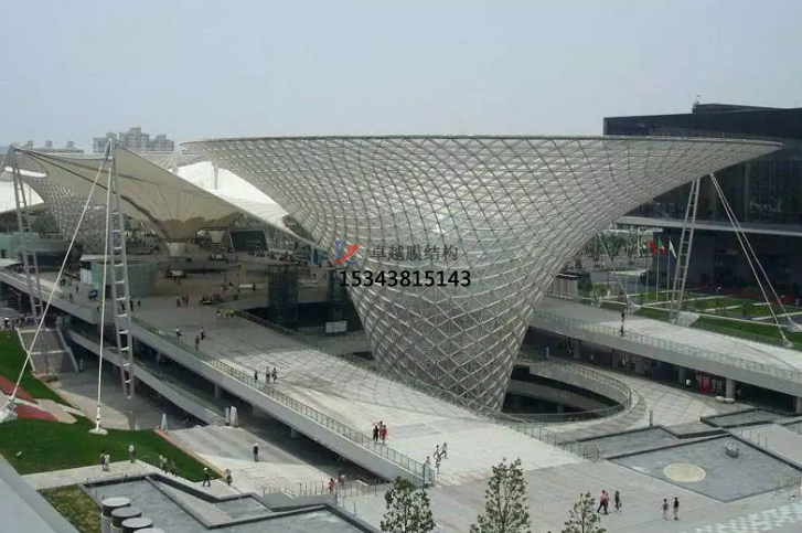 上海世博會世博軸膜結(jié)構(gòu)陽光谷。位于世博浦東園區(qū)的中心區(qū)域,南北長1045米,東西寬約110米,整體高40多米。作為到達世博主要場館的主入口,它起到了關(guān)鍵的引導(dǎo)交通和人流的作用。世博軸縱向設(shè)置了6個巨型圓錐體井狀采光結(jié)構(gòu)的“陽光谷”。世博軸外周設(shè)置了31根梭形柱,每根梭形柱至少設(shè)置了兩根拉地索。內(nèi)部還設(shè)置了19根桅桿柱,內(nèi)外柱子之間都通過高強鋼索相互連接。世博軸膜結(jié)構(gòu)采用Sheerfill I膜,共有69片單元,展開面積達68000平方米,更大的單片膜面積為1780平方米,相當(dāng)于4個標準籃球場,這些在世界建筑史上都是獨樹一幟的。從美觀角度考慮,在帽環(huán)處,局部采用雙層膜,整個建筑像一朵玻璃的喇叭花從地下悄然綻放,晶瑩剔透。該工程是國內(nèi)更大的全張拉索膜結(jié)構(gòu)工程,創(chuàng)造了膜結(jié)構(gòu)施工的奇跡。