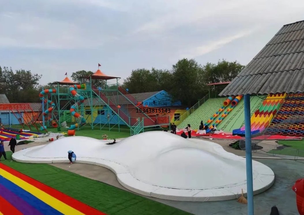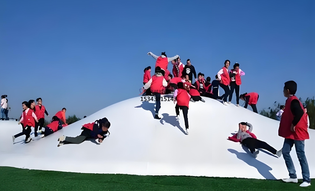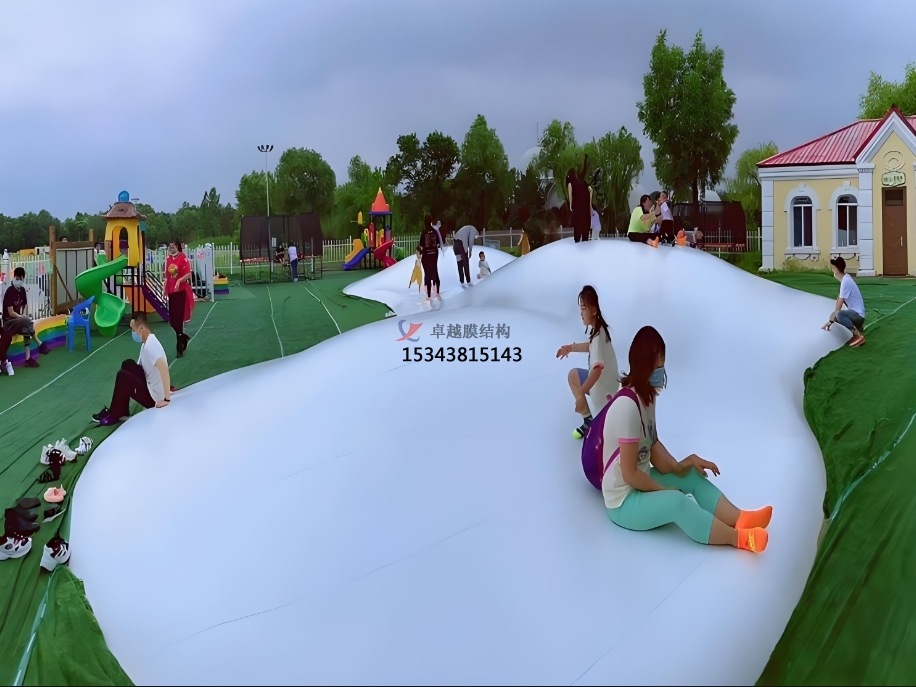 蹦蹦云的設(shè)計(jì)高度靈活,可根據(jù)場地環(huán)境定制形態(tài)與規(guī)模。無論是平坦空地還是起伏地形,均可通過設(shè)置沙坑、坡度或洞穴,塑造自然野趣的游樂場景。其純白外觀與云朵造型,既能融入景區(qū)生態(tài)景觀,也可作為商業(yè)地產(chǎn)的網(wǎng)紅打卡點(diǎn)。從親子樂園到度假村,從生態(tài)農(nóng)莊到特色小鎮(zhèn),蹦蹦云以 “可蹦、可滑、可躺” 的多維體驗(yàn),滿足全年齡段游客的互動需求。