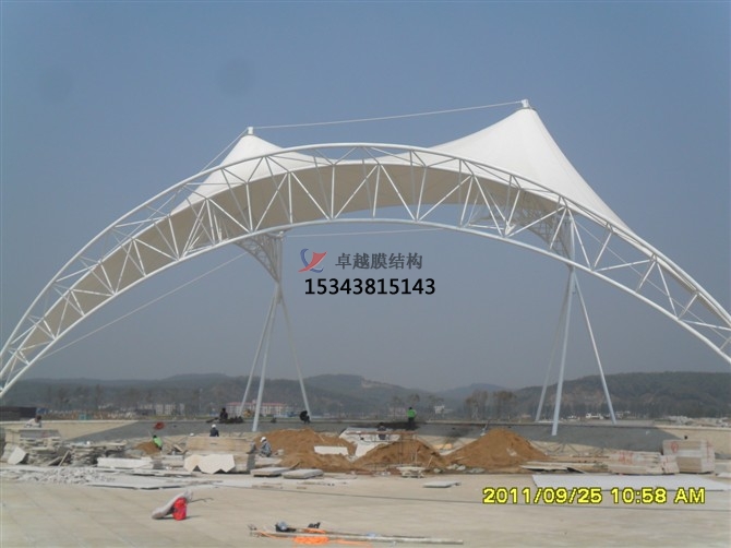 5、結(jié)構(gòu)穩(wěn)定,張拉膜結(jié)構(gòu)不是剛性的,其在風(fēng)荷載或雪荷載的作用下會(huì)產(chǎn)生變形。膜結(jié)構(gòu)通過(guò)變形來(lái)適應(yīng)外荷載,在此過(guò)程中荷載作用方向上的膜面曲率半徑會(huì)減小,直至能更有效抵抗該荷載。鄭州卓越膜結(jié)構(gòu)工程有限公司專(zhuān)業(yè)做膜結(jié)構(gòu)大門(mén)。