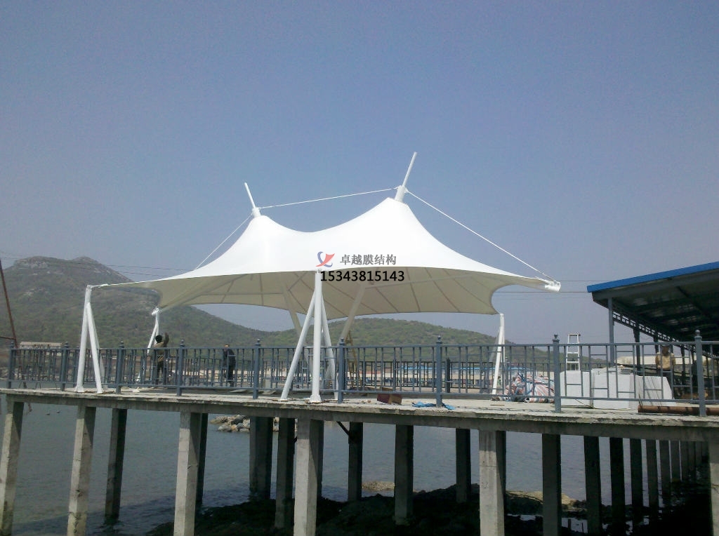 1、混凝土結(jié)構主體加鋼拱以上兩種簡單的膜結(jié)構,依平面的形狀,如方形、菱形等,可有許多變化,拱的間距依使用的膜材強度、設計荷載、風力等確定。