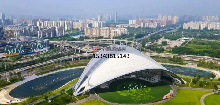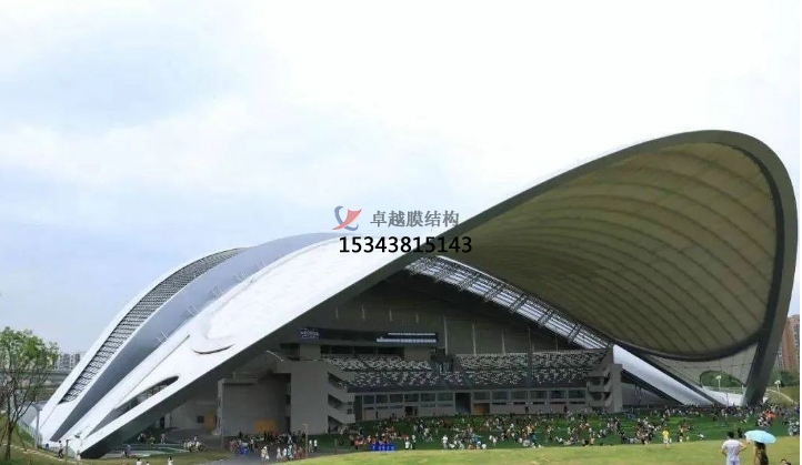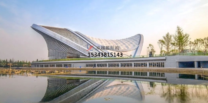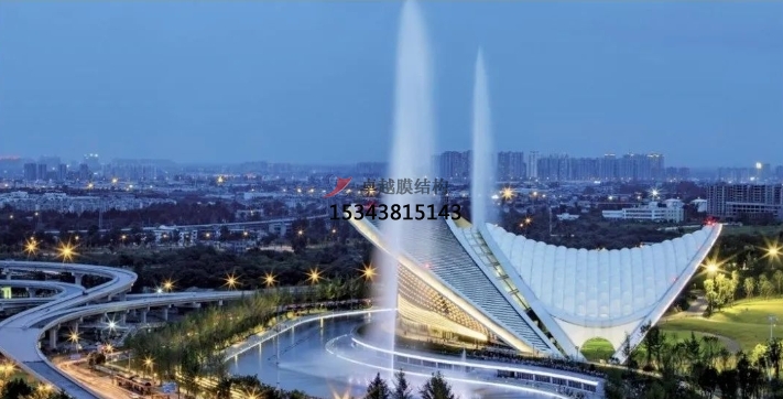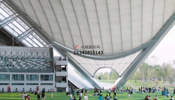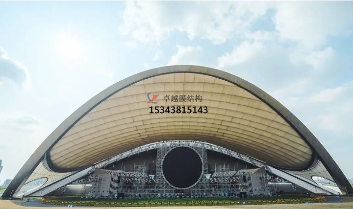 獨(dú)立罩棚屋面采用“索網(wǎng)+膜結(jié)構(gòu)”,自重輕,大幅減輕了主拱的荷載負(fù)擔(dān)。膜結(jié)構(gòu)分內(nèi)外兩層,起遮蔽作用的外層為PVDF膜,內(nèi)膜為網(wǎng)格膜材。值得一提的是,內(nèi)膜形成超過(guò)5000平方米的沉浸式可投影穹頂天幕,國(guó)內(nèi)較為罕見(jiàn),成為此演出地的亮點(diǎn)。