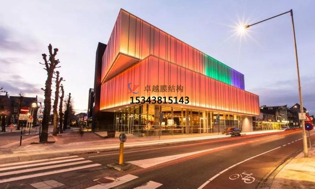 膜結(jié)構(gòu)和膜結(jié)構(gòu)幕墻的發(fā)展依賴于膜村的技術革命和技術發(fā)展,從歷史上來看,材料技術的革命為建筑學帶來越來越多的創(chuàng)意,也帶來無窮無盡的高要求。從現(xiàn)代主義到后現(xiàn)代主義,再到解構(gòu)主義建筑理論,甚至所謂混沌理論,無不例外地要求材料革命,而每次材料革命又給建筑學添上更多的新創(chuàng)作語匯。從建筑色彩學來看,透過建筑立面的顏色或本色看室內(nèi)的顏色,從亮到暗或從暗到亮,建筑師可根據(jù)層次深淺布局,色彩的冷暖安排,晝夜光源方向的異同,獲得自己想得到的建筑光學色彩效果。