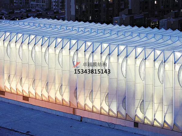 膜結(jié)構(gòu)建筑設(shè)計(jì)應(yīng)根據(jù)建筑物的使用特點(diǎn)和總平面要求,合理確定排水坡度和泄水位置,確保膜面排水順暢;在雪荷載較大的地區(qū),應(yīng)采用較大的膜面坡度和必要的防積雪措施。