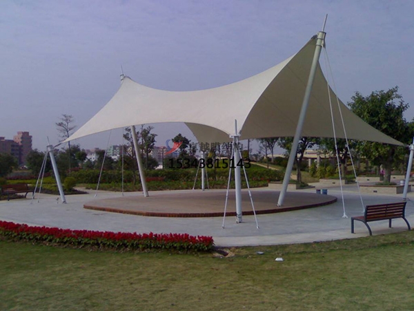張拉式膜結(jié)構(gòu)以膜材、鋼索及支柱構(gòu)成,利用鋼索與支柱在膜材中導入張力以達安定的結(jié)構(gòu)形式。除了可實踐具創(chuàng)意,創(chuàng)新且美觀的造型外,也是更能展現(xiàn)膜結(jié)構(gòu)特性的構(gòu)造形式。近年來,大型跨距空間結(jié)構(gòu)也多采用以鋼索與壓縮材構(gòu)成鋼索網(wǎng)來支撐上部膜材的形式。因施工精度要求高,結(jié)構(gòu)性能強,且具豐富的表現(xiàn)力,所以造價略高于骨架式膜結(jié)構(gòu)。張拉索膜結(jié)構(gòu)中膜曲面通過預應力維持自身形狀,膜既是建筑物的圈護體又作為結(jié)構(gòu)來抵抗外部荷載效應。