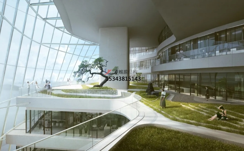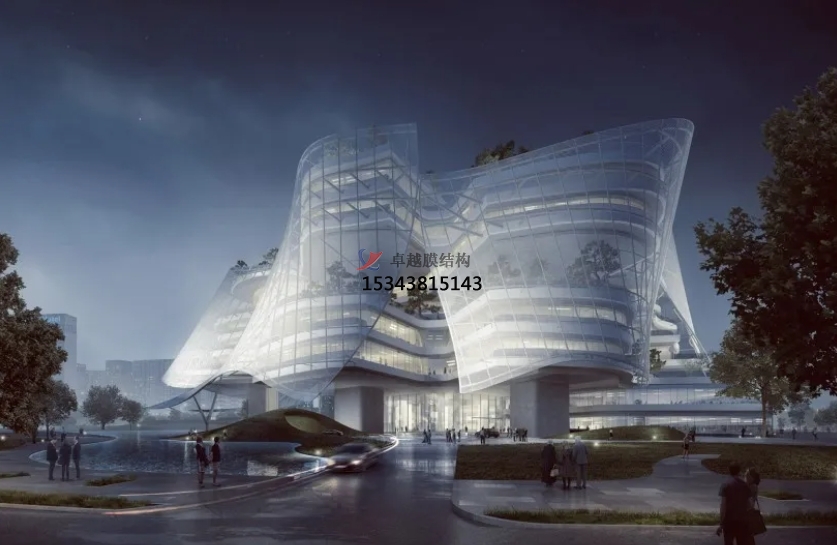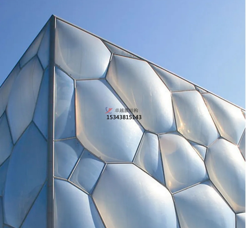 膜結(jié)構(gòu)使得建筑輕盈感十足,膜材料的良好透性使得建筑界面透光而不透視。由于該材料(ETFE)氣枕在陽光底下富有通透感光線可以通過漫射和折射進(jìn)入界面,讓膜結(jié)構(gòu)建筑呈現(xiàn)出朦朧夢(mèng)幻之美。