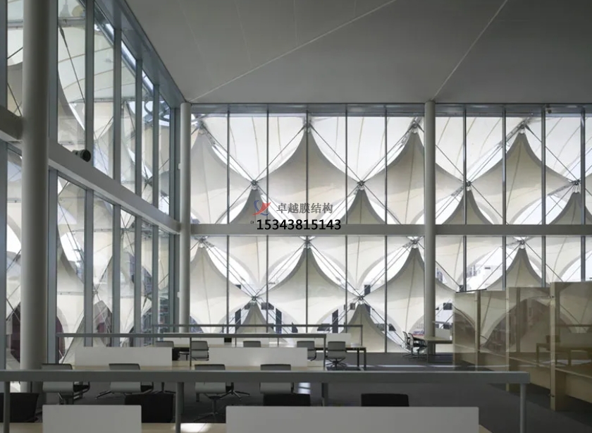 圖書館改建部分是一座正方體結構的建筑。館區(qū)的樓墻分里外兩層,層次分明。每個層面都有各自的特點,里層是玻璃和混凝土結構,外層是復雜的鋼結構,利用預應力的外層鋼結構支撐起非常立體的菱形紡織物的遮陽蓬外表皮。