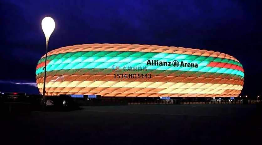 安聯(lián)球場的外墻由許多個ETFE氣枕構成,內(nèi)嵌發(fā)光系統(tǒng),超過三十萬個LED燈可在夜晚組成1600 萬種顏色圖形。它是世界上最早能實現(xiàn)變色的球場。由于每個表皮構建有34度的斜角,即使身處最高層看臺也能提供同樣棒的視覺效果。