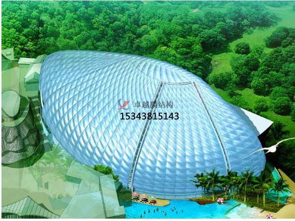 ETFE膜結(jié)構(gòu)材料無定形,只有維持張力平衡的形狀才是穩(wěn)定的造型,可充分發(fā)揮膜結(jié)構(gòu)材料抗拉強(qiáng)度高的特點(diǎn),應(yīng)用合理的支撐結(jié)構(gòu)體系。
