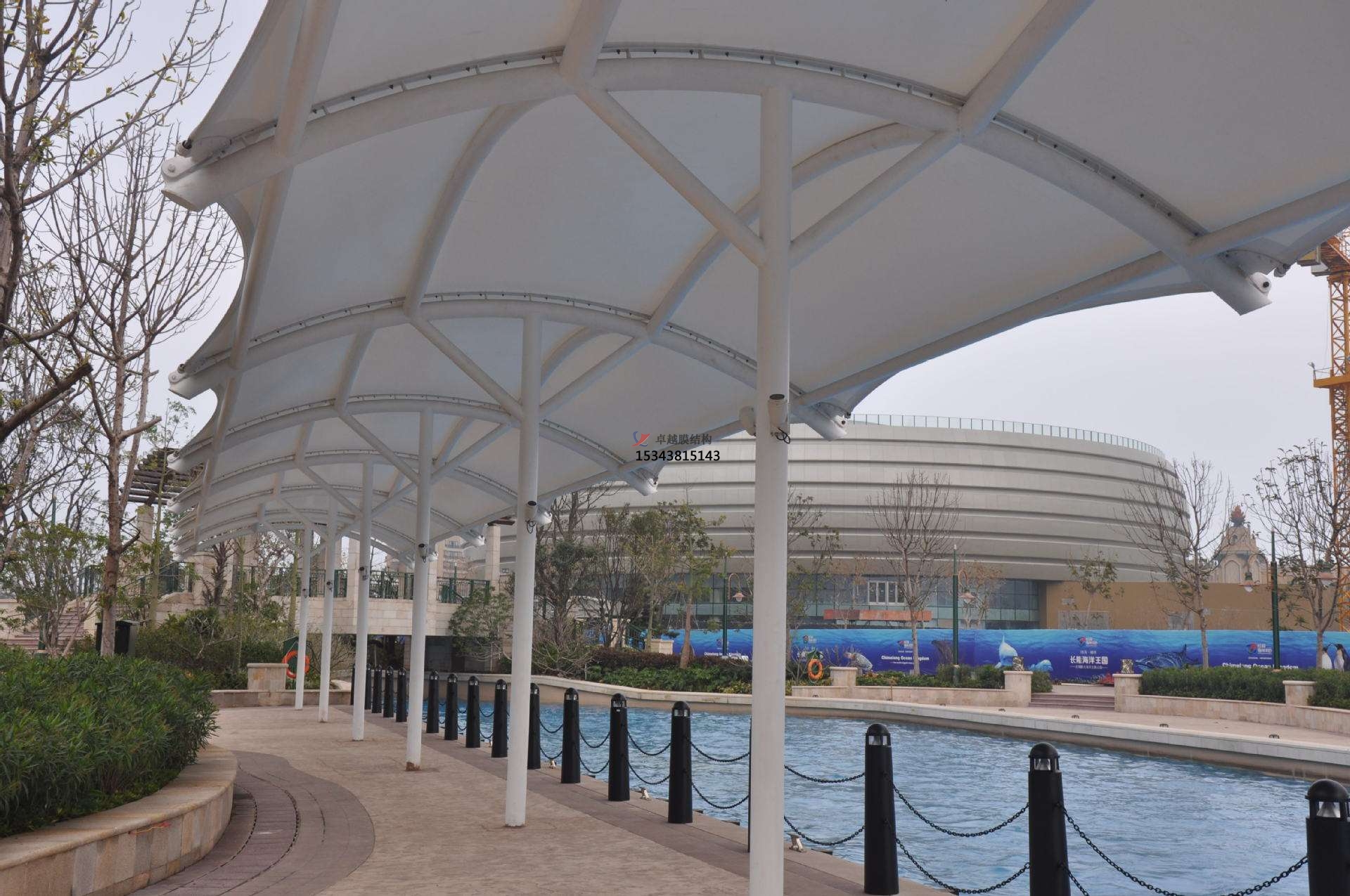 2、PVC建筑膜材開發(fā)和應用得比較早,通常規(guī)定PVC涂層在玻璃纖維織物經(jīng)緯線交點上的厚度不能少于0.2mm,一般涂層不會太厚,達到使用要求即可。PVC本身不耐老化,多用于臨時建筑。
