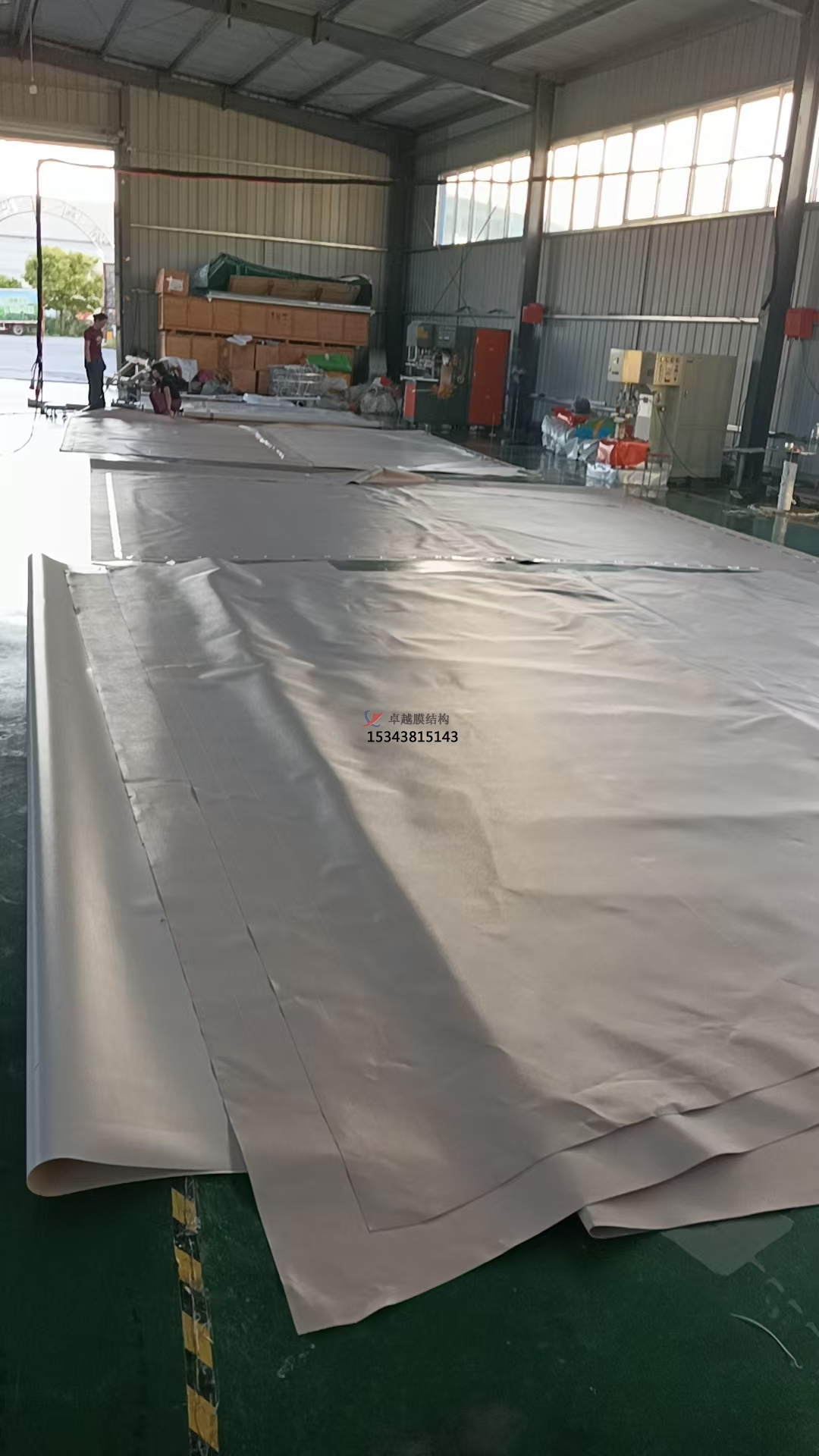設(shè)計者需根據(jù)施工現(xiàn)場及安裝設(shè)備等情況,確定膜面的展開方向及折疊包裝的順序,加工好的膜面在兩面清洗后,按指定要求進(jìn)行折疊包裝。為防止在膜表面留下明顯折痕,PTFE 成品膜在折疊時應(yīng)襯入圓紙筒;