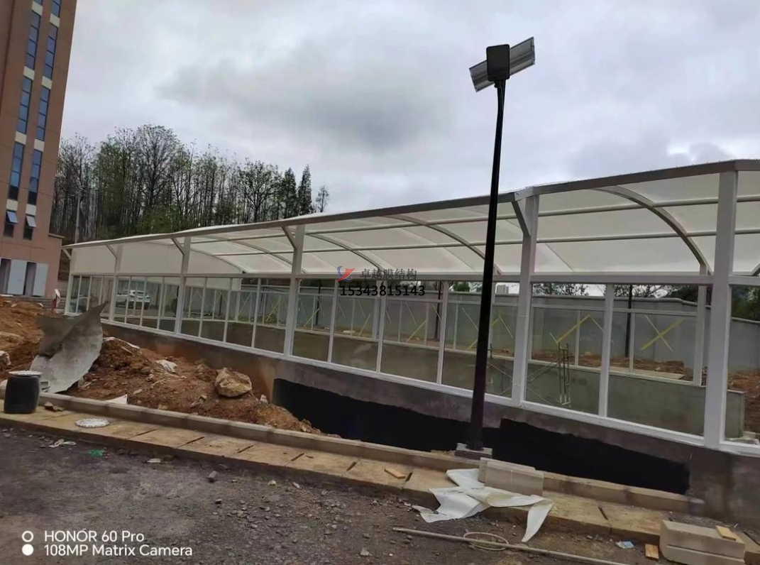 膜結(jié)構(gòu)資料具有杰出的柔韌性,能夠塑造出豐富多樣的造型。無論是簡練流暢的直線型,還是優(yōu)雅靈動的曲線型,亦或是富有創(chuàng)意的異形,都能與修建全體風(fēng)格相交融,為地下車庫出入口增加共同的美感。如一些現(xiàn)代化的商業(yè)修建,其地下車庫出入口選用了膜結(jié)構(gòu)雨棚,共同的造型與修建外觀相輔相成,提高了整個修建的層次和吸引力。