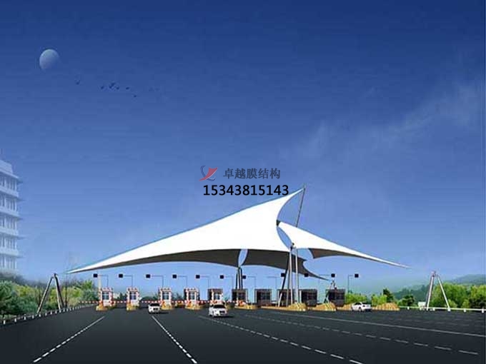 二、收費(fèi)站頂棚并不是傳統(tǒng)意義上的一個遮陽擋雨的覆蓋頂棚,隨著人們審美的不斷提高,除了要求頂棚具有實用性功能外,還要有一定的美觀性,因此,在充分發(fā)揮膜布的性能條件下,搭配先進(jìn)的張拉技術(shù),可以將頂棚張拉成不同的形狀,使收費(fèi)站更具有藝術(shù)美感。