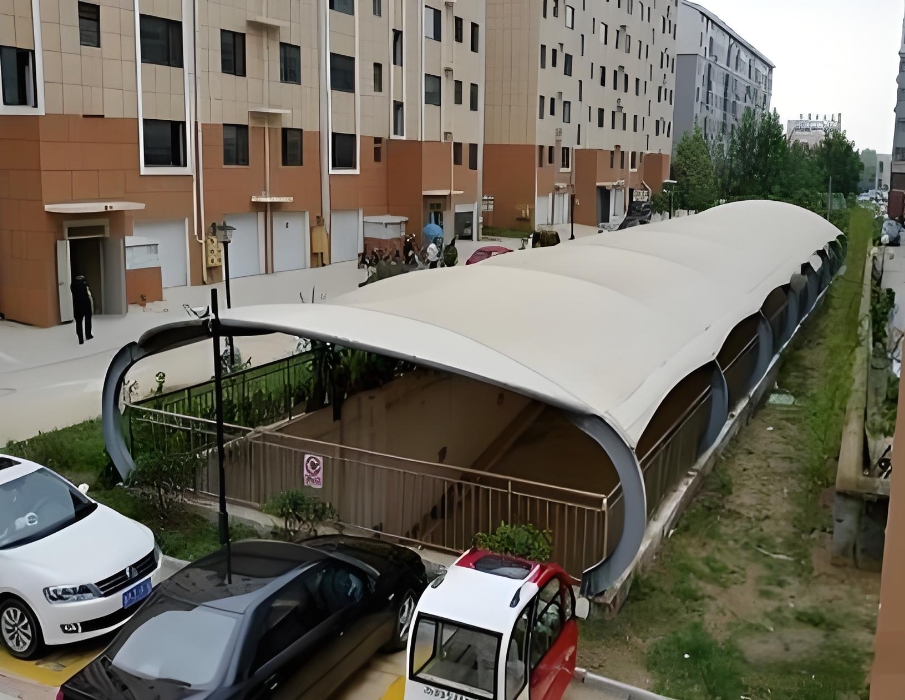 在住宅小區(qū)中,膜結(jié)構(gòu)頂棚也得到了廣泛的應(yīng)用。例如,北京某住宅小區(qū)的車庫出入口采用了膜結(jié)構(gòu)頂棚,其透光性和遮陽效果為居民提供了一個舒適的出行環(huán)境,同時(shí)也提升了小區(qū)的整體品質(zhì)。