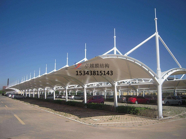 二,膜結(jié)構(gòu)建筑頂部封板采用PVC/PVDF/PTFE/ETFE膜布制作,與建筑整體骨架用壓條鉚接固定,耐酸堿腐蝕,有足夠強度對棚內(nèi)車輛起到保護作用;