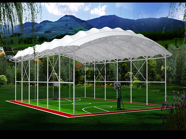 張拉膜的結(jié)構(gòu)空間形態(tài) ,張拉膜結(jié)構(gòu)的基本形態(tài)有鞍面、錐面、拱承面、波形面等。這些基本形態(tài)除了上迷的張拉膜結(jié)構(gòu)共同的空間特點(diǎn)之外還有著不同的空間形態(tài)特點(diǎn)。鞍形而張拉膜結(jié)構(gòu)的高點(diǎn)和低點(diǎn)都在膜面周邊,空間形態(tài)流暢開(kāi)放,中央?yún)^(qū)域高度適中,空間利用率較高。錐形面高點(diǎn)在膜面中間,低點(diǎn)在周圍,空間形態(tài)比較內(nèi)聚。由于膜面中部升起較高,_且空間越向上越狹小,相對(duì)來(lái)說(shuō)其內(nèi)部空間不容易被充分利用,拱承張拉膜膜面中央拱承部分較高,然后向兩邊逐漸降低,當(dāng)多個(gè)拱承膜面組合在一起時(shí)所形成的內(nèi)部空間比較容易被充分的利用,波形面張拉膜脊谷索交替排列,內(nèi)部空間也高低起伏,一般來(lái)說(shuō)脊索和谷索間隔距離不會(huì)太大,波形部分空間很難被利用。 從上述的分析中我們發(fā)現(xiàn),雖然張拉膜結(jié)構(gòu)的結(jié)構(gòu)厚度是所有結(jié)構(gòu)形式中更小的,只有薄薄的一層膜的厚度,但是整個(gè)膜面結(jié)構(gòu)的高度卻比一般的結(jié)構(gòu)來(lái)的大(這里的膜面結(jié)構(gòu)高度指的是膜面結(jié)構(gòu)的更低點(diǎn)至級(jí)高點(diǎn)的長(zhǎng)度)。這是由于張拉腆結(jié)構(gòu)的膜面曲率越大,獲得同樣剛度所需要的預(yù)應(yīng)力越小.結(jié)構(gòu)越穩(wěn)定。為了減少膜面內(nèi)部應(yīng)力,增加結(jié)構(gòu)的穩(wěn)定性.張拉膜結(jié)構(gòu)必須保持合適的膜面曲率。錐形張拉膜.單元頂高度與平面跨度之比一般大于1:5,小于1:1鞍形面要中央平坦區(qū)城的曲面曲率大于3%。