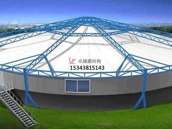2、膜結(jié)構(gòu)是目前發(fā)展很快的一種新型空間結(jié)構(gòu),是一種效率極高的張力集成體系,可以充分發(fā)揮鋼索的強(qiáng)度與張拉整體結(jié)構(gòu)的空間作用。它通過鋼骨架、鋼索與膜材共同受力形式穩(wěn)定曲面來覆蓋建筑空間,具有高度的形體可塑性和結(jié)構(gòu)靈活性,即通過對膜材內(nèi)部施加一定的預(yù)張力,使其具備了抵抗外荷載能力,從而充當(dāng)結(jié)構(gòu)材料的一種結(jié)構(gòu)體系。我公司先后在眉山地區(qū)承接污水池處理池膜結(jié)構(gòu)封閉的設(shè)計(jì)施工,簡介如下: