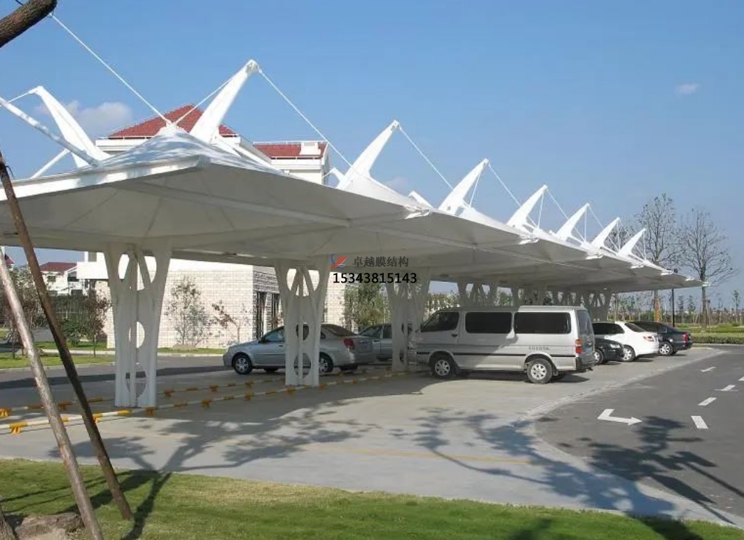 雙挑膜結(jié)構(gòu)車棚錯落有致地排列著,不僅為車輛提供了庇護,還宛如一件件精美的藝術(shù)品,與周圍的綠化景觀、建筑風(fēng)格相得益彰,極大地提升了整個區(qū)域的環(huán)境美感和品質(zhì)檔次。