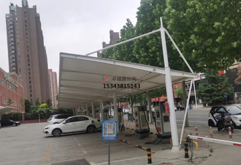 膜結(jié)構(gòu)小轎車充電樁停車棚雨棚是最近幾年才流行起來的,因為電動小轎車有大型的充電樁,為了充電的安全,就有了膜結(jié)構(gòu)小轎車充電樁停車棚雨棚。