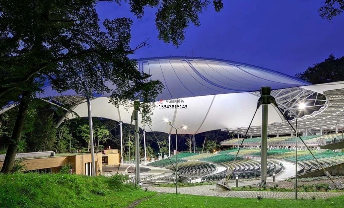 舞臺膜結(jié)構(gòu)遮陽棚的膜材料具有一定的透光性,可以根據(jù)演出需要調(diào)節(jié)光線的明暗和色彩。在白天,自然光透過膜材料灑落在舞臺上,為演出增添了一份自然和溫馨;在夜晚,舞臺燈光與膜材料的透光性相結(jié)合,可以營造出夢幻般的舞臺效果。