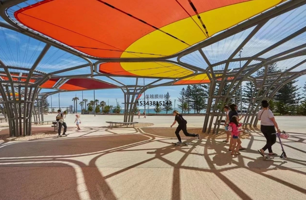 未來的景觀棚膜結構將不再僅僅局限于單一的遮陽避雨功能,而是會朝著多功能融合的方向發(fā)展。比如,在景觀棚內(nèi)集成光伏發(fā)電系統(tǒng),將太陽能轉(zhuǎn)化為電能,實現(xiàn)能源的自給自足;或者結合聲學設計,使其具備良好的隔音效果,可用于舉辦小型音樂會、演講等活動;還可以與水幕景觀、噴泉等水景元素相結合,打造出更加豐富多彩的戶外體驗空間。