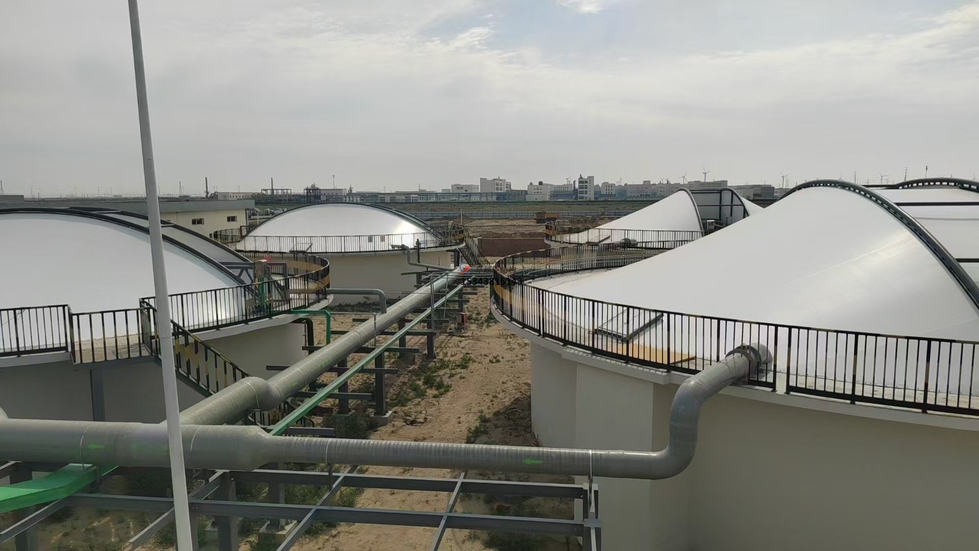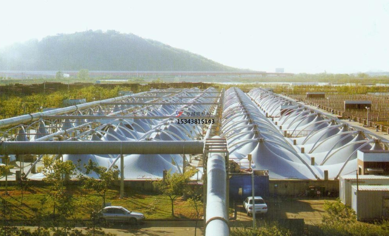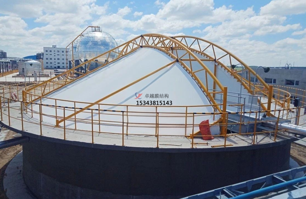 污水池反吊膜,顧名思義,是一種將薄膜材料以反吊的方式覆蓋在污水池上方的結(jié)構(gòu)。這種結(jié)構(gòu)通過鋼架或索網(wǎng)等支撐體系,將膜材料緊繃并固定于污水池上方,形成一個(gè)密閉或半密閉的空間,有效隔絕污水池內(nèi)的惡臭氣體和有害物質(zhì),防止其對(duì)外擴(kuò)散,同時(shí)保護(hù)膜材料免受污水池內(nèi)腐蝕性氣體的侵蝕。