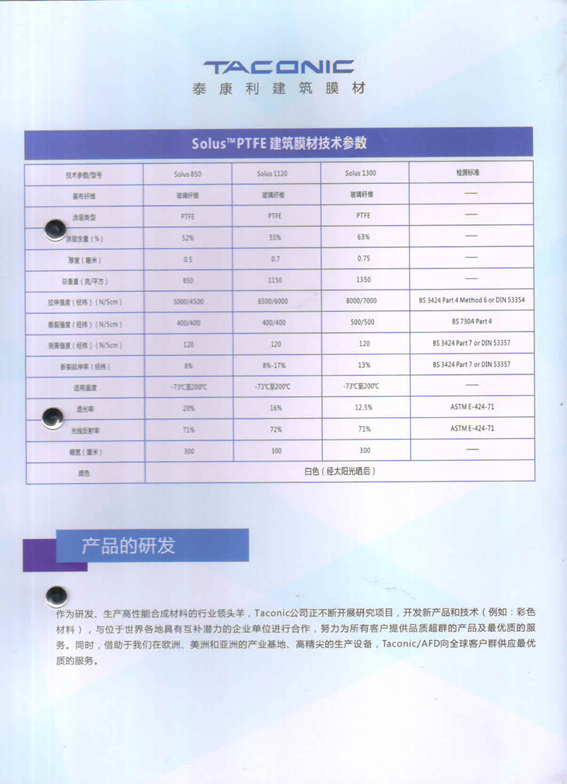 針對建筑用織布結(jié)構(gòu)市場對高性能PTFE /織布的日益增長的需求,Taconic公司于1988年在愛爾蘭廠生產(chǎn)出了第面PTFE涂層建筑用織布。
