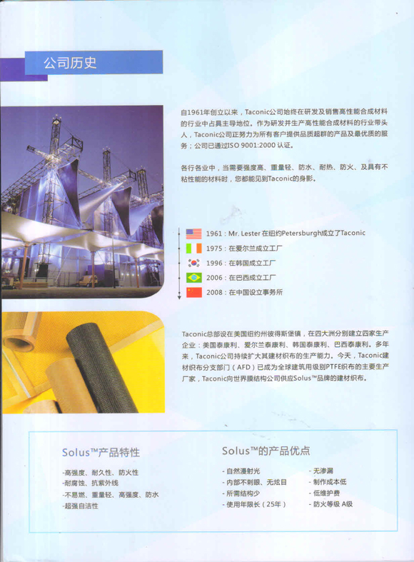 十多年來,Taconic公司持續(xù)地擴 大了其建材織布的生產(chǎn)能力。今天,Taconic的建 材織布分支部門](AFD)已成為全球建筑用級別PTFE /織布的主要生產(chǎn)廠家,Taconic向全世界織布結(jié)構(gòu)公司供應Solus 品牌的建材織布。借助于我們在歐洲,美洲和亞洲的產(chǎn)業(yè)基地,Taconic/AFD 通過其分布各地的加工,銷售和服務(wù)網(wǎng)絡(luò)向全球客戶群供應優(yōu)質(zhì)服務(wù)。